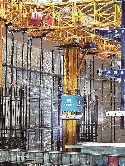 记者了解到,这个高20.45米的“云端智造工厂”,是用于高层建筑建设的高度集成化、智能化的大型自爬升建造装备平台,俗称“造楼机”。和一般的“造楼机”相比,这个“工厂”模拟了智能制造工厂环境,由空中平台、智能装备、智能控制三大系统组成,利用机器人集群、AI监控系统、数字化平台等智能建造设备和智造技术,提升施工效率。相较于传统外部爬架,“工厂”立柱设计在建筑内部,操作人员直接在室内施工,不仅不用顶着烈日工作,还降低了高空作业风险。